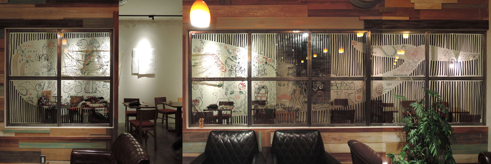 2015/12/1-2, acrylicpaint on the glass, 120cm × 480cm, Marugo deli aeon mall, Okayama, Japan